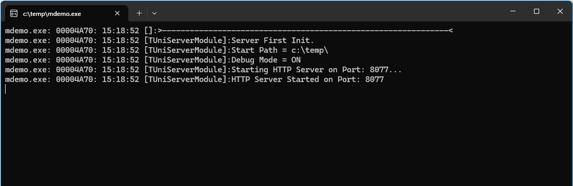 Normalmente, qualquer aplicação de console mostrará uma janela de console. Esta janela será ocultada pelo código de runtime do servidor uniGUI. Para manter esta janela visível existe uma propriedade chamada HideConsoleWindow em ServerModule. Esta opção está True por padrão, o que significa que a janela de console será ocultada. Definir esta propriedade como False manterá a janela de console visível e também redirecionará os logs do servidor uniGUI para esta janela. Isso pode ser útil para depuração.