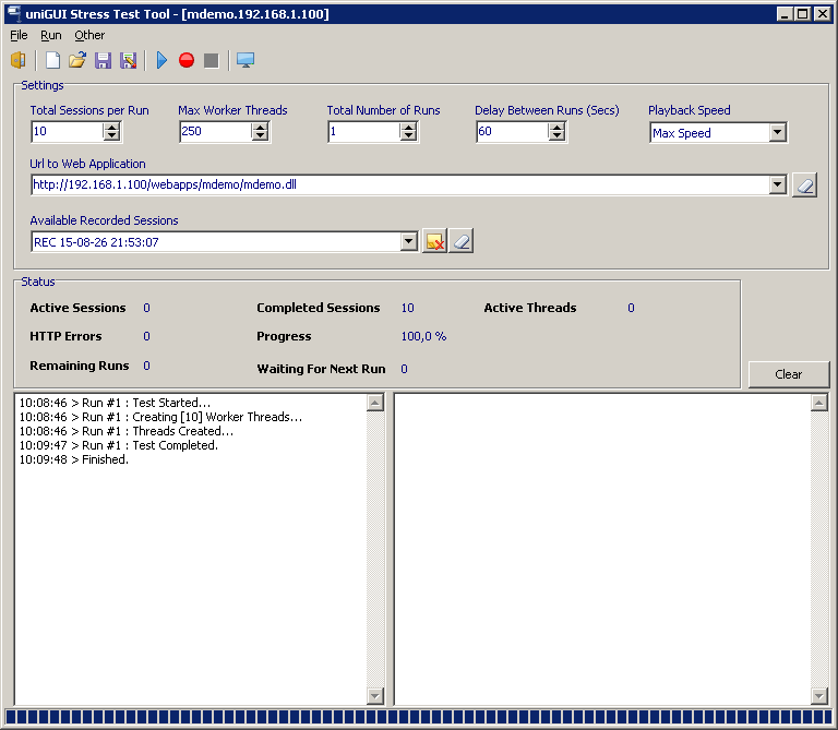 Usando esta ferramenta você pode gravar uma sessão web e então reproduzi-la para simular o comportamento de múltiplos usuários em um ambiente de produção. A Stress Test Tool armazena cada ambiente de teste em um arquivo de projeto que pode ser usado posteriormente para repetir o teste. Um projeto salva todas as suas sessões gravadas e parâmetros de teste. É recomendável criar um projeto Stress Test separado para cada projeto uniGUI. Projetos Stress do uniGUI são armazenados na pasta Projects com a extensão (*.uprj)