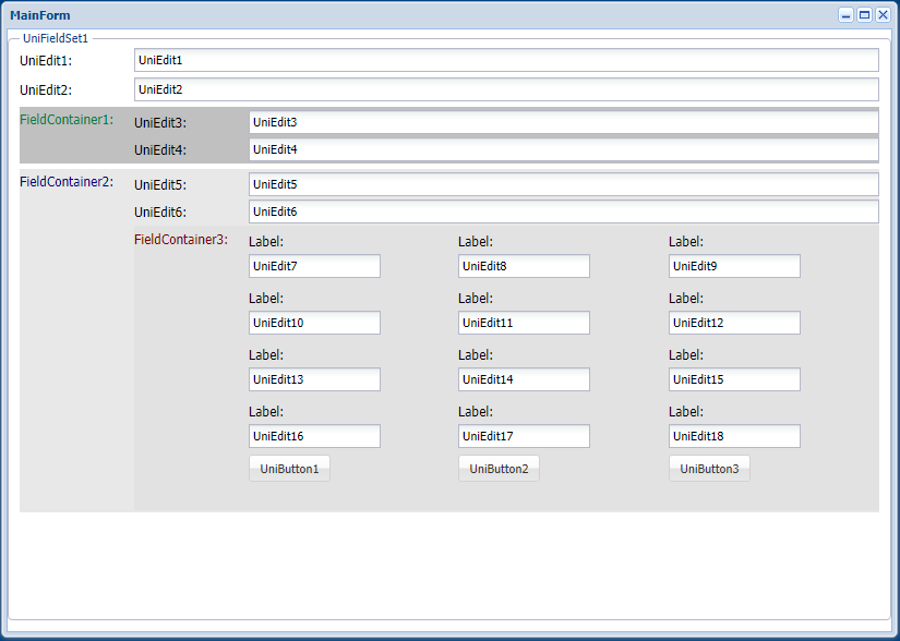 Entre os controles uniGUI que podem ser incluídos em um TUniFieldSet está o TUniFieldContainer, que permite criar formulários hierárquicos como: