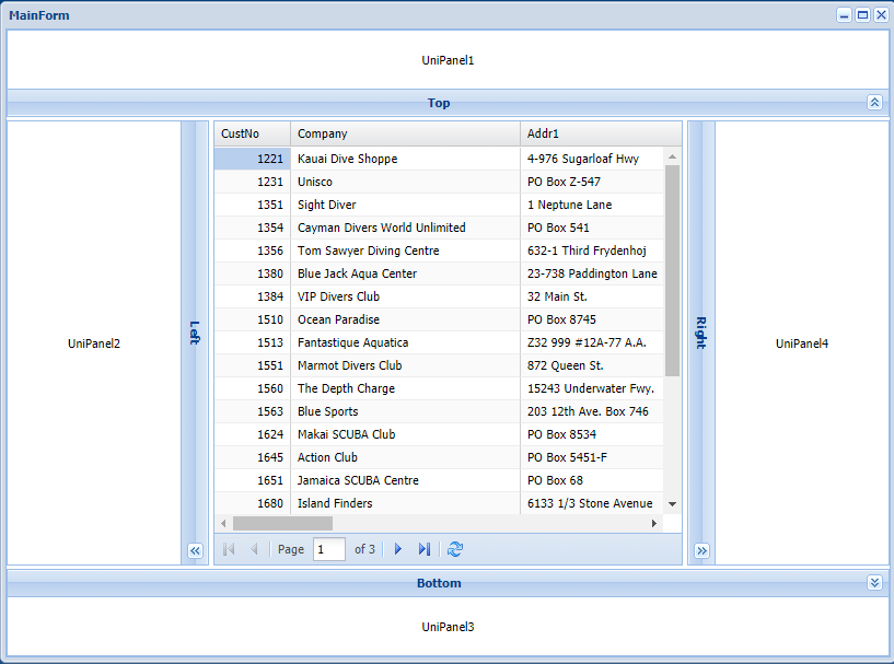 Esta demo começa com alguns painéis recolhidos e todos os quatro podem ser recolhidos ou expandidos usando os botões correspondentes. Você notará que cada requisição de recolher/expandir requer uma ida ao servidor para renderizar o novo layout. Tente alterar esse comportamento mudando o AlignmentControl do formulário para uniAlignmentClient e configurando os controles usando as propriedades web descritas anteriormente. Confirme que a nova aplicação executa mudanças de layout muito mais rápido (não há mais necessidade de pedir ao servidor uma nova renderização).