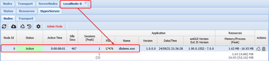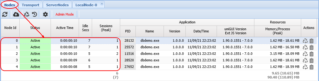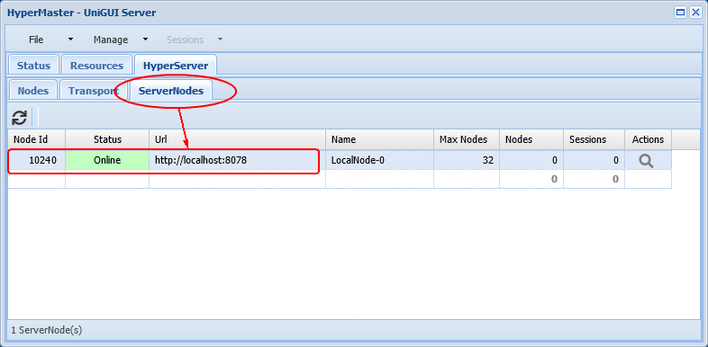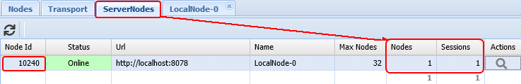 Na página ServerNodes você verá informações do Node e das sessões. ServerNodes recebem IDs começando em 1024 (por exemplo, um ServerNode com Node Id 1024 tem um Node ativo e uma sessão em execução).