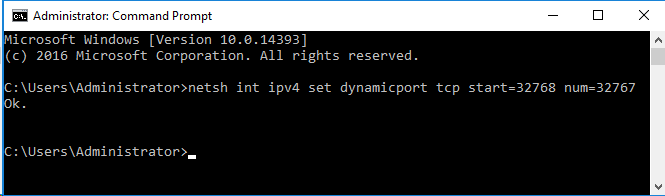 netsh int ipv4 set dynamicport tcp start=32768 num=32767Isso cria uma faixa de portas dinâmicas de 32.767 portas começando na porta 32768. Certifique-se de que as portas do HyperServer Node estejam abaixo desse número de porta inicial.
