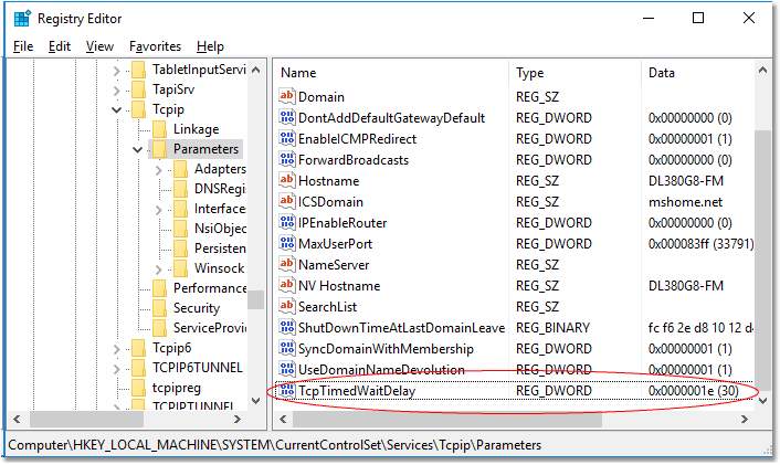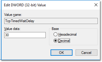 | Chave: | HKEY_LOCAL_MACHINE\SYSTEM\CurrentControlSet\Services\Tcpip\Parameters | | Valor: | TcpTimedWaitDelay | | Tipo de dado: | REG_DWORD | | Intervalo: | 30-300 (decimal) | | Valor padrão: | 0x78 (120 decimal) | | Valor recomendado: | 30 (decimal) — 0x1E (hex) | | Valor existe por padrão? | Não — precisa ser adicionado. |