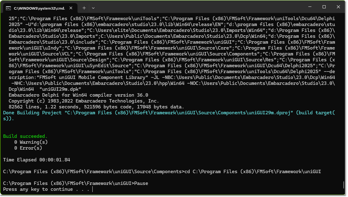 Gerar arquivos de biblioteca usando os arquivos batch é simples: execute o arquivo batch correto para a versão do Delphi para a qual você deseja criar os arquivos de biblioteca. O único pré-requisito é executar o Delphi ou o IDE do C++ uma vez após instalar o uniGUI; caso contrário o msbuild pode falhar ao encontrar alguns caminhos relacionados necessários para localizar arquivos fonte ou arquivos DCU.