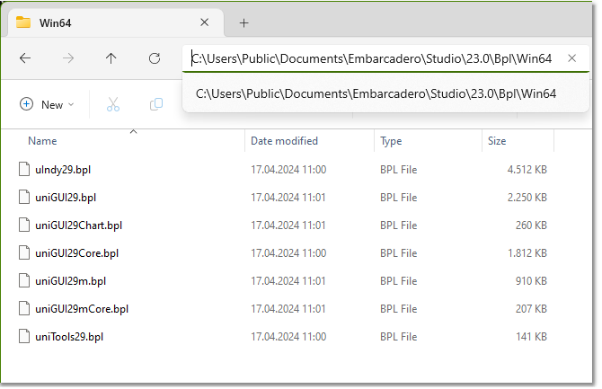 Os arquivos BPL gerados podem ser encontrados no caminho de biblioteca padrão do RAD Studio. Na imagem abaixo estes são arquivos BPL de 64 bits para Delphi 12.0.