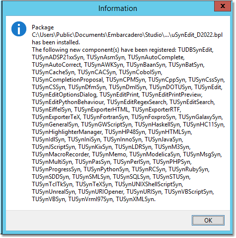 Compile todos os pacotes no Gerenciador de Projeto começando por SynEdit_Rxxxx.bpl.