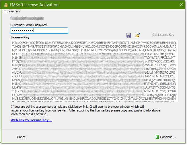A partir da versão 0.99.95, as chaves de licença são obtidas diretamente de um servidor de ativação. Você pode obter sua chave de licença inserindo sua senha e pressionando o botão Obter Chave de Licença. Isso preencherá a área Chave de Licença com a chave apropriada. Alternativamente, você pode clicar no link azul "Web link to license key..." que abrirá uma página do navegador contendo sua chave. Você pode colar a chave na área Chave de Licença.