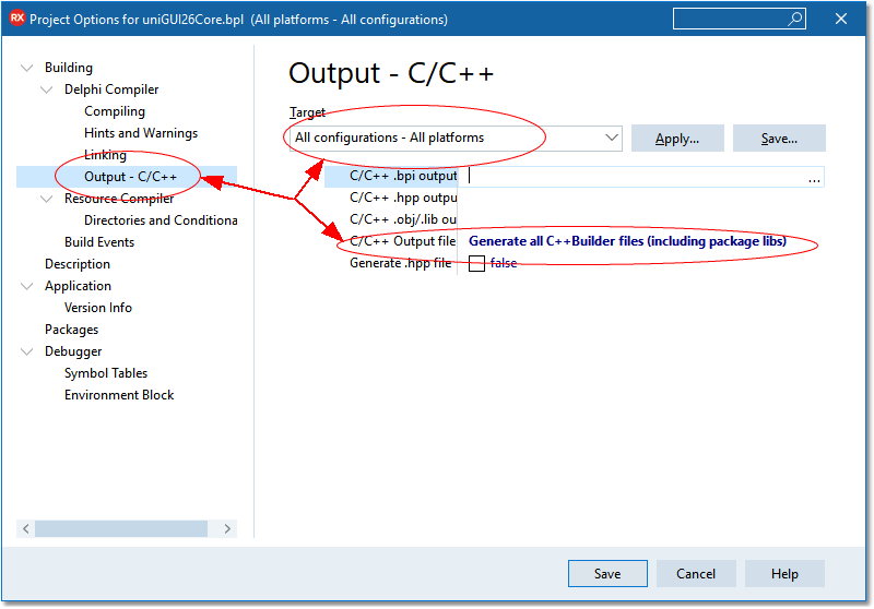 Nota: A partir da versão uniGUI 1.90.0.1537 todos os pacotes foram modificados para gerar todos os arquivos relacionados ao C++ por padrão. Se você estiver instalando a versão 1.90.0.1537 ou posterior, pode pular a etapa Gerar todos os arquivos do C++Builder.