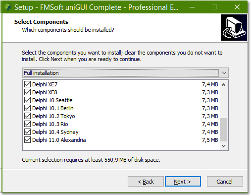 FMSoft_uniGUI_{Edition_0.XX.0.YYYY}.exe Esta é a que será instalada no PC do desenvolvedor para fins de desenvolvimento.