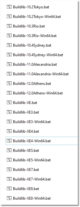 These batch files can generate library files for both Win32 and Win64 platforms. This is especially useful if you intend to deploy Win64 applications along with Delphi Runtime Packages (both C++ Builder and Delphi).
