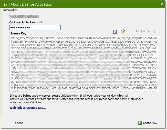 Starting from version 0.99.95 the license keys are directly obtained from an activation server. You can get your license key by entering your password and pressing the Get License Key button. This will fill the License Key area with an appropriate key. Alternatively you can click the blue link "Web link to license key..." which will open a browser page containing your key. You can paste the key in the License Key area.